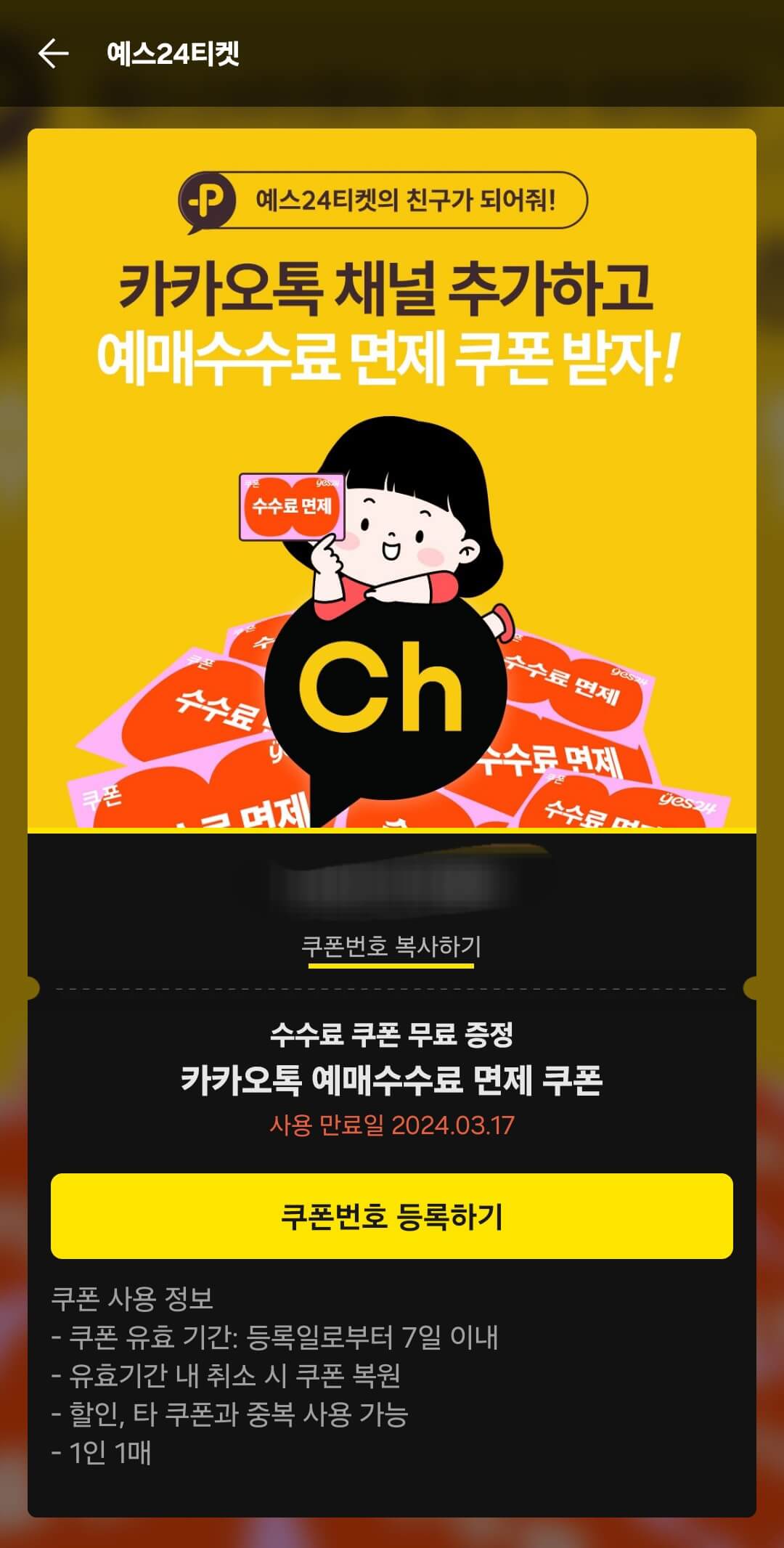 2.채널홈으로 들어가면 예매수수료 면제쿠폰이 보이실 꺼에요.