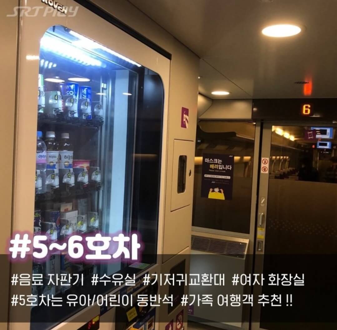 5호 6호차 사이에는 음료자판기와 수유실 기저귀교환대가 있어요. 특히 5호차는 유아 어린이 동반석이 있기 때문에 가족여행객에게 추천드려요.