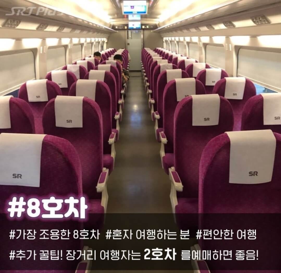 📌 1호차는 수서역에서 가장 가깝고 빠르게 이동할 수 있다는 장점이 있습니다. 사실인지는 모르나 8호차가 가장 조용하다는 이야기가 있는데요. 장거리 여행차는 2호차를 예매하는 게 좋다고 하네요.