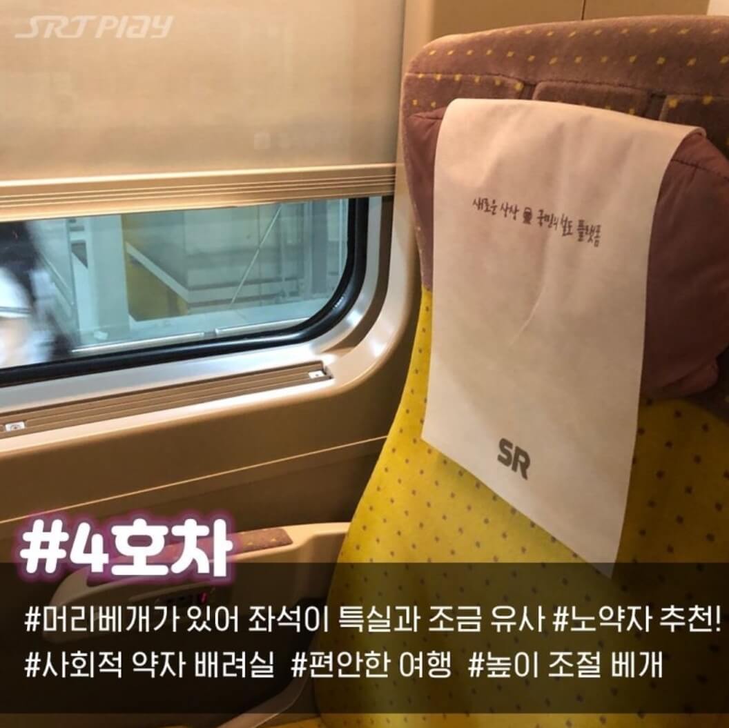 4호차는 머리베개가 있어 좌석이 특실과 조금 유사해요. 노약자에게 추천드립니다.